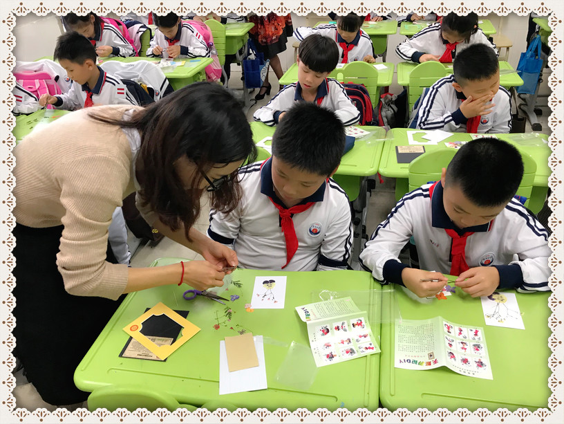 指导我们开展活动的是陈老师,她穿着一条黑裙子,戴着一副黑眼镜,带着阳光般灿烂的笑容,微笑地看着我们,给我们介绍押花的历史。原来,押花艺术是两千多年前就有了,由颜色鲜艳的花经过整理、加工、脱水,保持花的原有色彩和形态,经过创作者的精巧构思和艺术设计,粘贴制作而成的一种艺术品。老师还给我们介绍一些获奖的押花作品,那精美的图案造型,实在是太美了!我猜要把这些押花做得这么漂亮,那一定不容易。